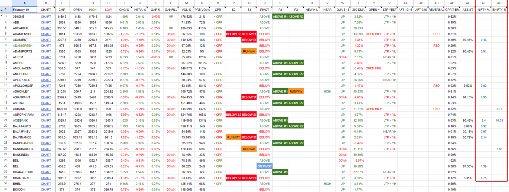 For example, if Nifty is up 0.8% but you sort the Nifty% column and see that 35 out of 50 stocks are actually in the red, that tells you something about market breadth. Or if BankNifty is flat but HDFC Bank, ICICI Bank, and Kotak Bank are all showing strong volume and sitting near their intraday highs, you might read that as sectoral strength that hasn’t fully reflected in the index yet. It’s a quick sanity check before you decide whether to trade the index futures or pick individual stocks.