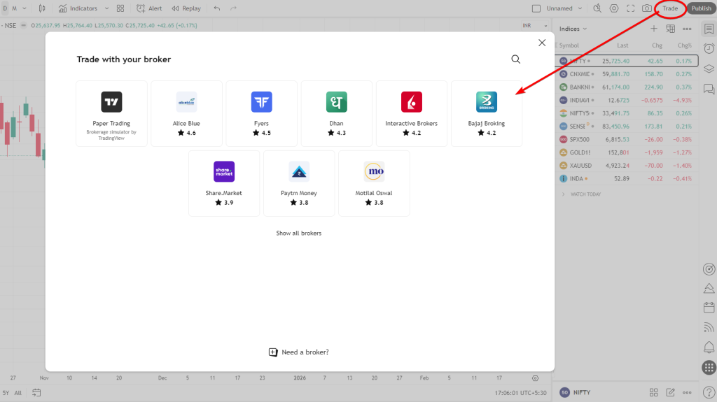 Indian traders can now execute orders directly through TradingView using their Bajaj Broking accounts. This integration combines TradingView’s professional-grade charting tools with Bajaj Broking’s trading infrastructure, eliminating the need to switch between platforms for analysis and execution.