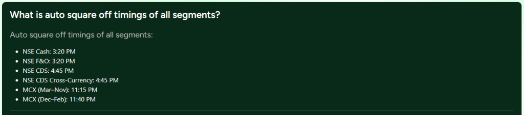 Disclaimer on Broker Charges and Timings: Please note that the auto square-off timings and charges mentioned for other brokers (Zerodha, Groww, Upstox, Angel One, ICICI Direct, Kotak Securities, Paytm Money, Sharekhan, Fyers) are based on information generally available in the public domain and can be subject to change by the respective brokers. Trading policies, charges, and timings are frequently updated. We highly recommend that you verify the most current and accurate details directly with your broker’s official website or customer support before making any trading decisions.